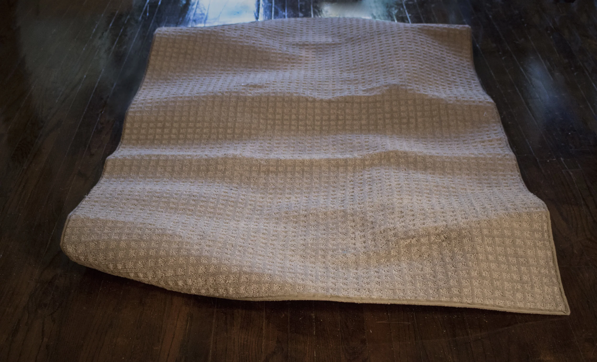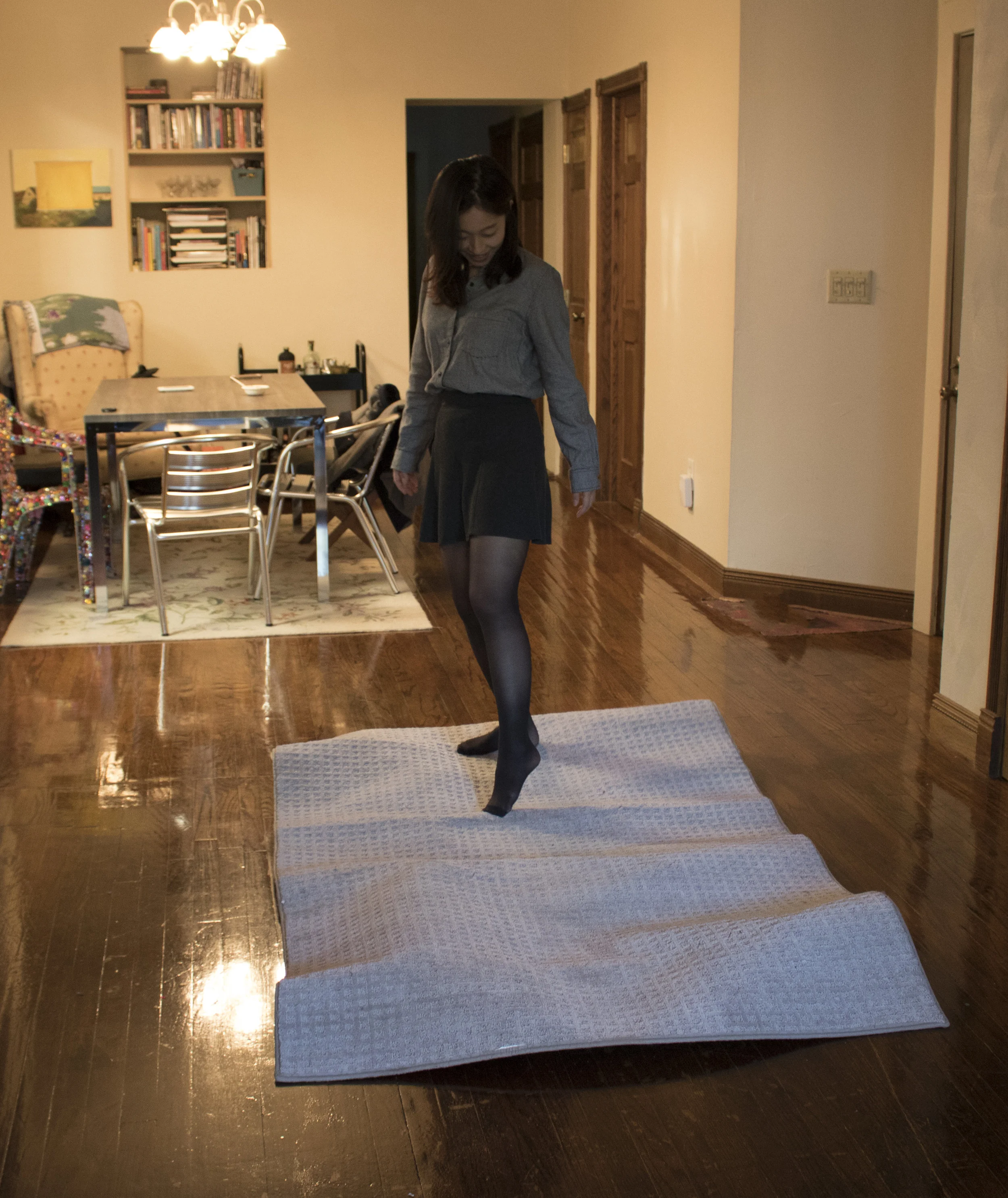 Interactive sculpture. 2015. Purchased rug, plastic 'yarn', legs from multiple rocking chairs.